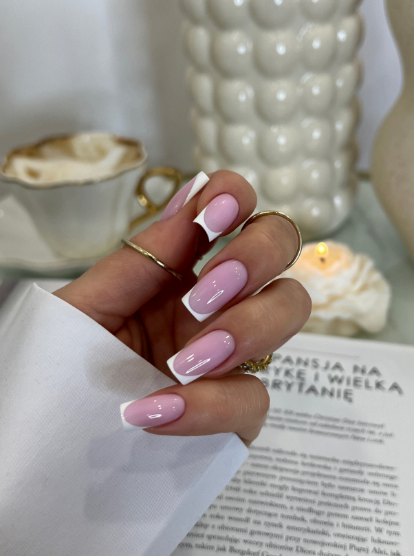 “Slim Nails” forma niższa i szablon klasyczny + french, to stylizacja dzięki której dosłownie zatrzęsłam branżą. Na każdym kroku, widzę dziewczyny które inspirują się tym stylem.